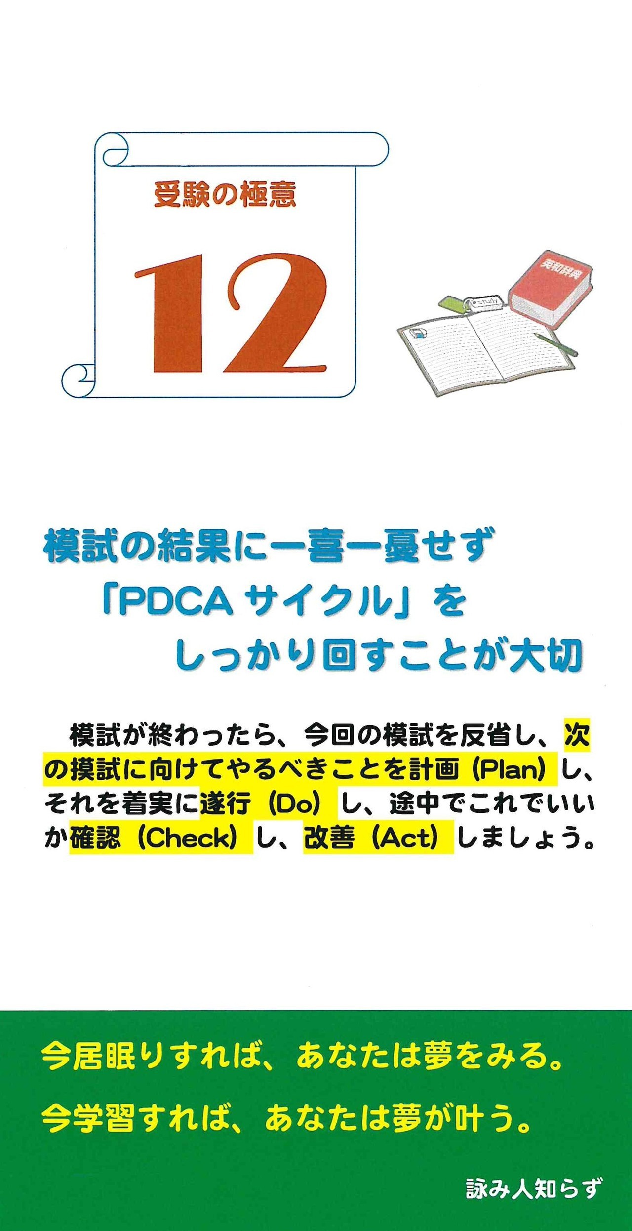 清楓義塾が考える「受験の極意」と、受験に役立つ「名言・格言」を1ヵ月カレンダーにしました。入塾者にプレゼントしています。
