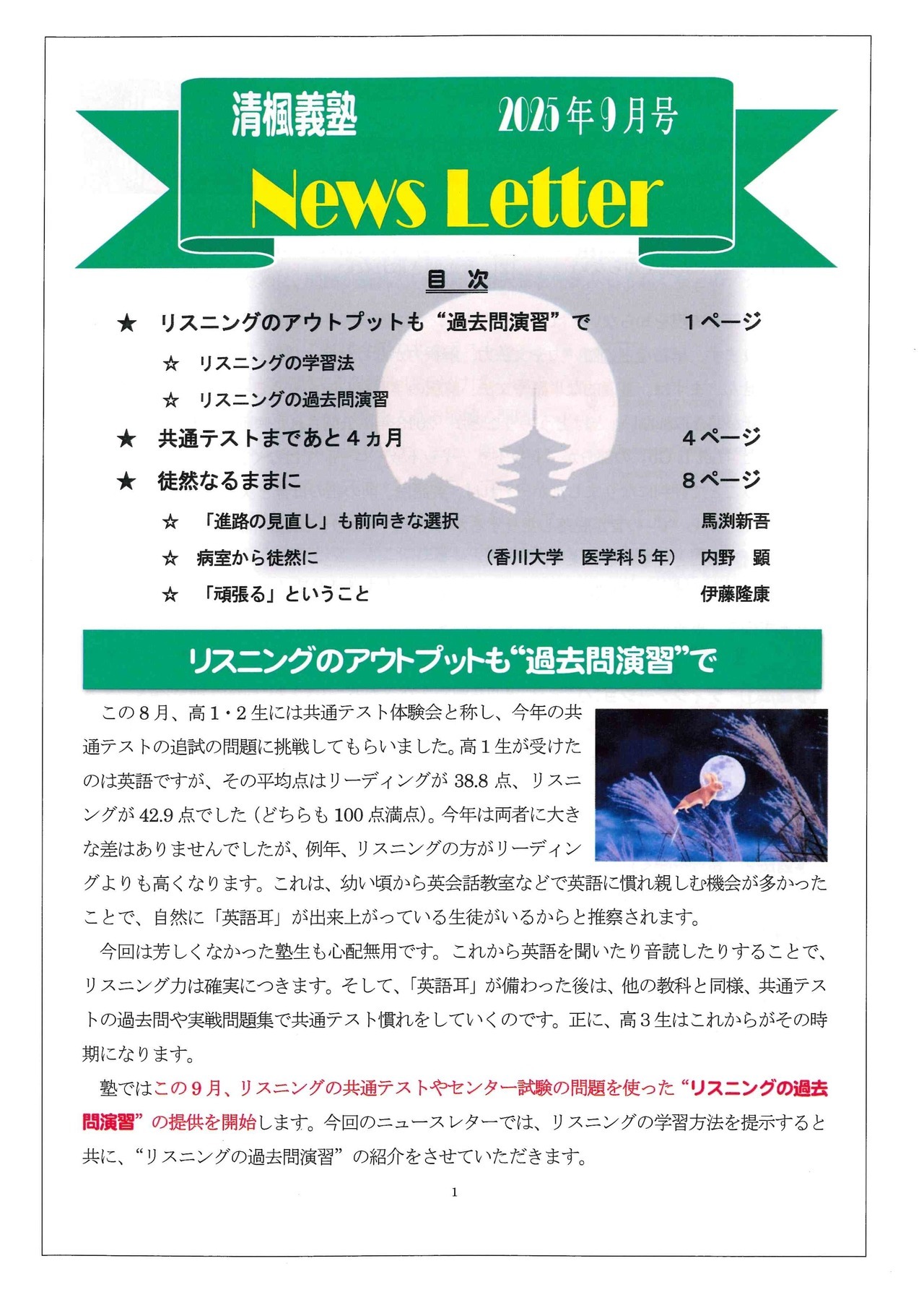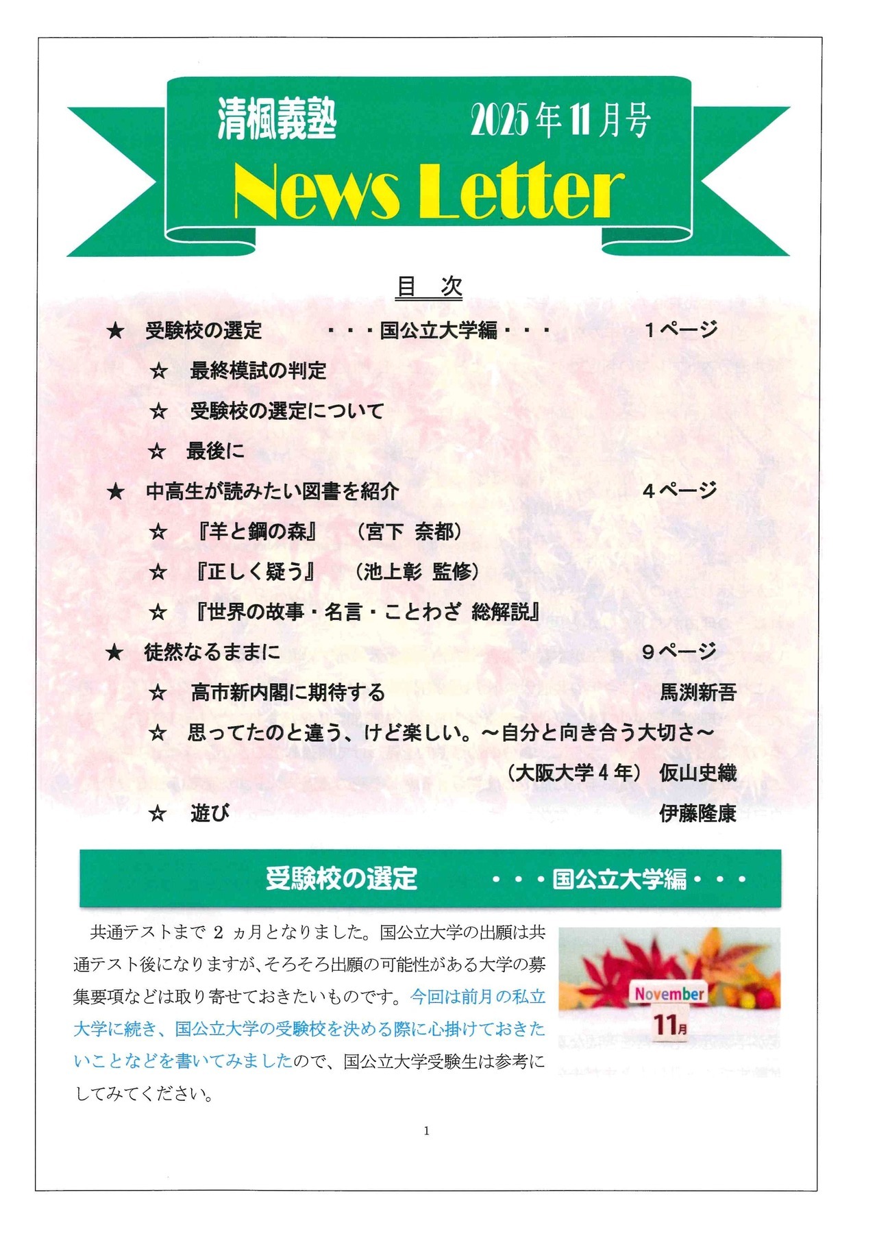 清楓義塾では、毎月1回、ご自宅に塾便りを発送しています。塾便りには次のものを入れています。