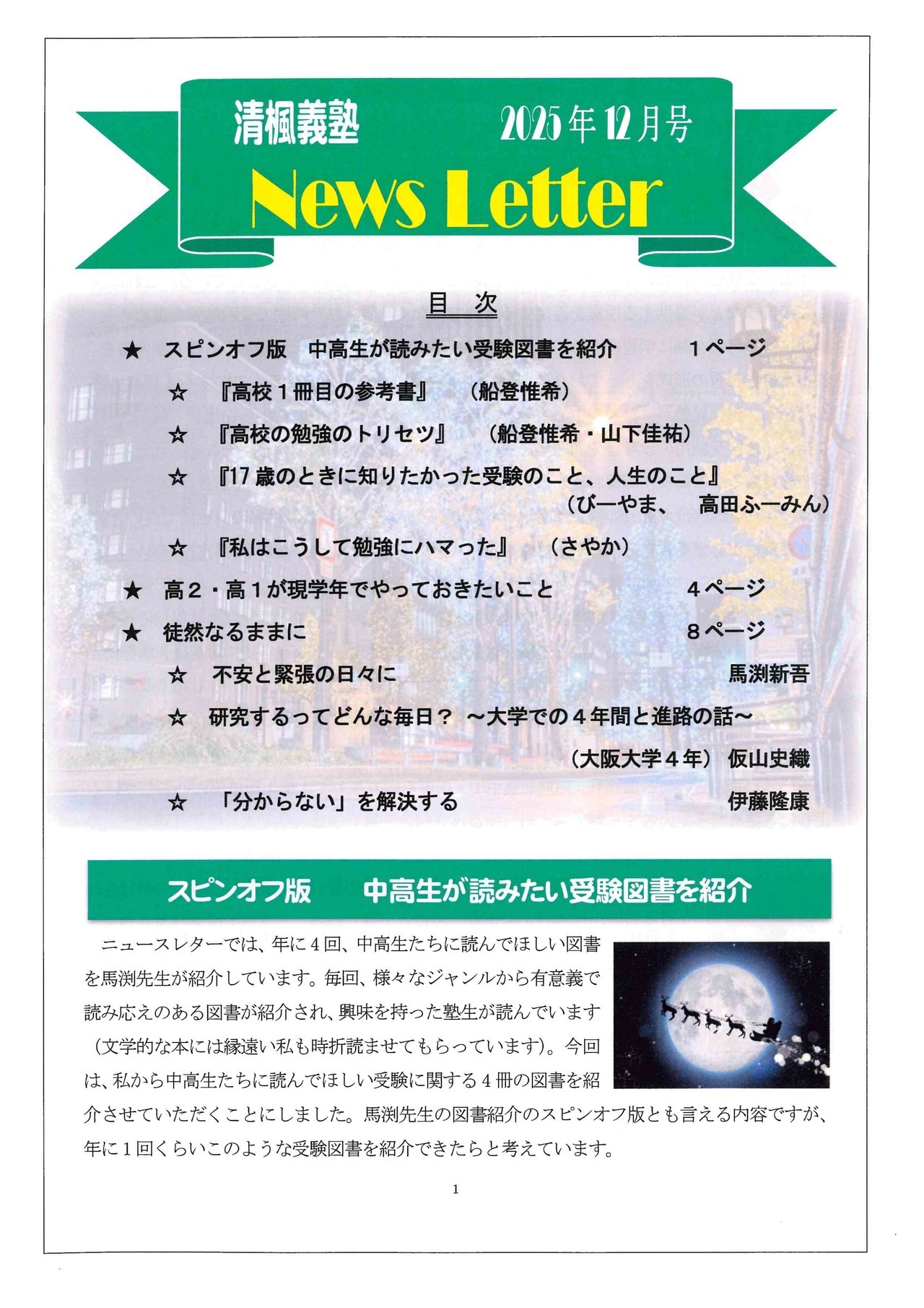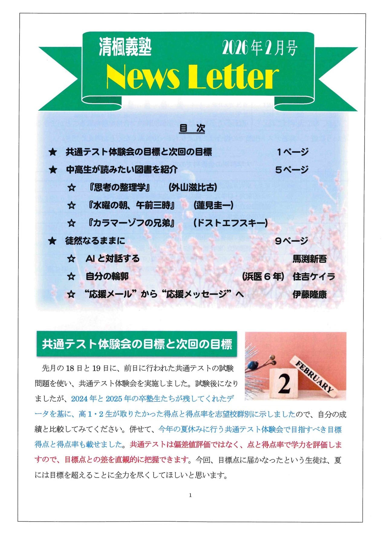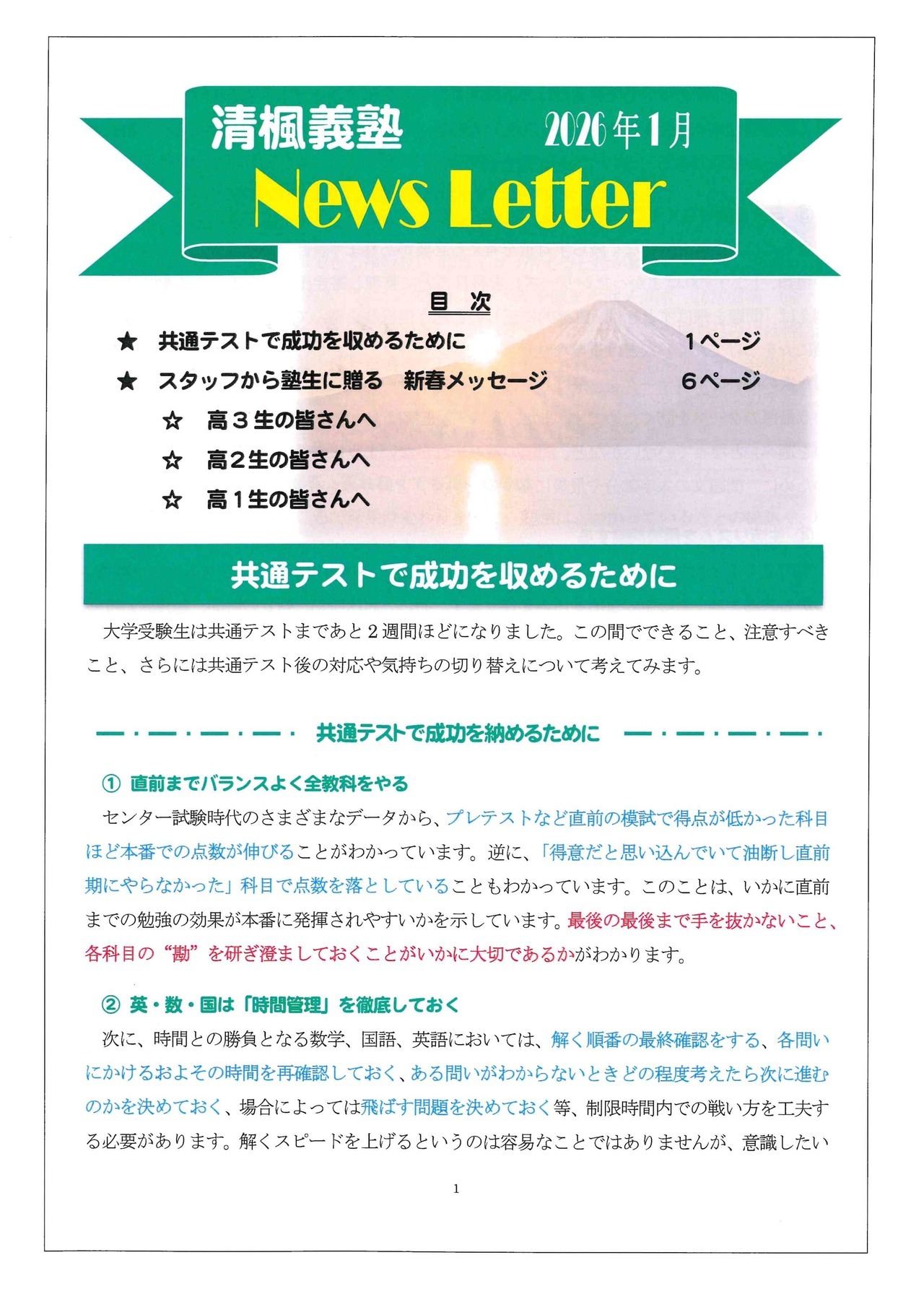 新年初となるニュースレターですが、今年は少し趣向を変えて、清楓義塾の全スタッフから塾生たちに新年のメッセージを贈ることにしました。ぜひ、スタッフたちの熱いメッセージを読んで、今年1年の抱負に活かしていただければと思います。